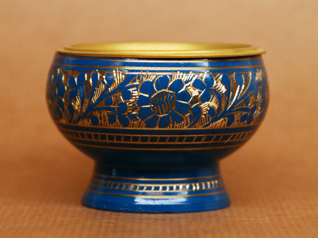 This blue incense burner symbolises calm, clarity and spiritual depth. Decorated with golden floral patterns and a radiant gold trim, it supports meditation and prayer by carrying intentions upward with the rising smoke. Its chalice-like form with pedestal base is both practical and symbolic, offering safe use with charcoal while neatly collecting ashes. More information can be found below.